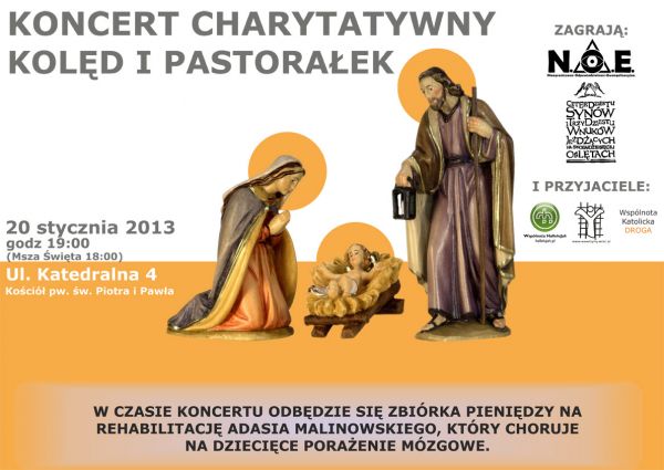 W najbliższą niedzielę, 20 stycznia ok. godz. 19 odbędzie się charytatywny koncert kolęd i pastorałek w kościele śś. Piotra i Pawła. Koncert zostanie poprzedzony pierwszą niedzielną Mszą Św. w naszej wspólnocie, która rozpocznie się o godz. 18.