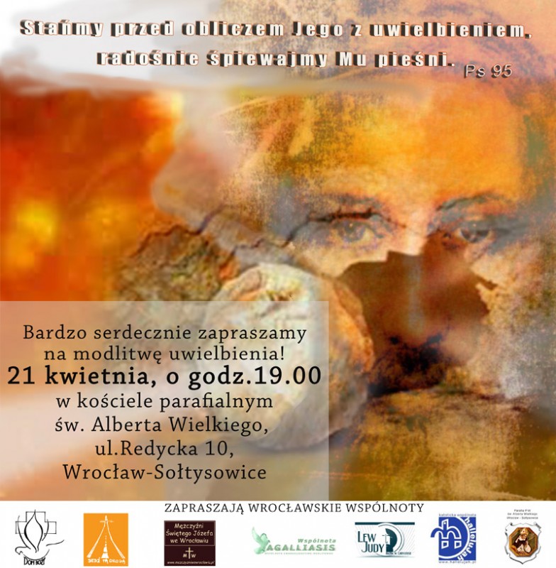 Serdecznie zapraszamy na modlitwę uwielbienia na wrocławskich Sołtysowicach. Odbędzie się ona 21 kwietnia o godz. 19 w kościele parafialnym św. Alberta Wielkiego przy ul. Redyckiej 10.